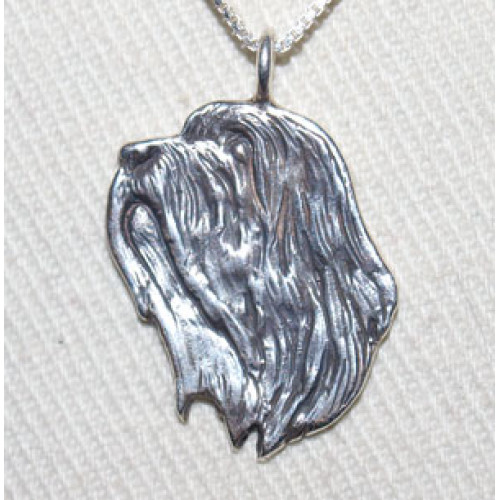 Hängsmycket Bearded Collie Stort Huvud är ca 19 mm brett och 25 mm högt, och tillverkat i sterling silver. Hunden är antikbehandlad, lackerad och har en liten svart, handmålad nos. Hänget har en fastlödd ringögla för enkel montering på en halskedja.
