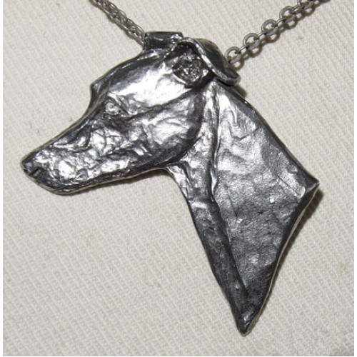 Hänge med ett huvud av en Greyhound tillverkat i tenn. Huvudet har ett svart öga i strass från Swarovski. Hänget är ca 50 mm brett och 50 mm högt. Hänget har en ögla på baksidan för enkel montering på en kedja. (Modell 11P)