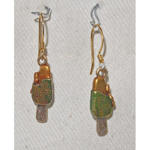 Handmålade örhängen med berlocker guldoxiderat tenn föreställande en smältande glasspinne som börjat rinna.Örhängena är för hål i öronen och de har krokar i guldpläterad mässing dekorerade med spiraler.