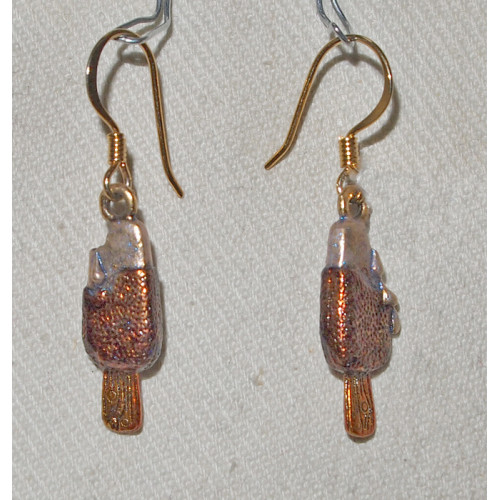 Handmålade örhängen med berlocker guldoxiderat tenn föreställande en smältande glasspinne som börjat rinna.