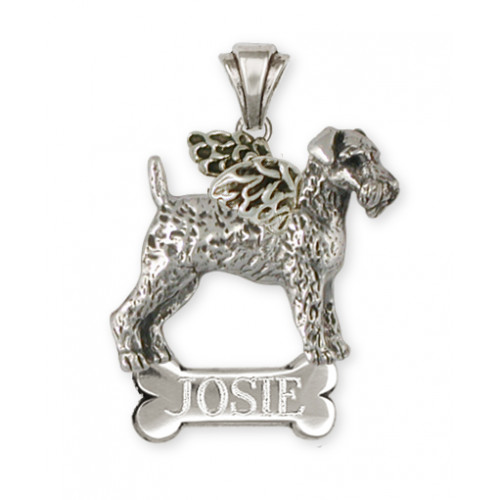 Hundängel Airedaleterrier nr AR10 stående på en polerad bricka formad som ett tuggben, som hänge med vackert skulpterad ögla kan du beställa tillverkad i sterling silver. Hunden är ca 25 mm bred och 26 mm hög, nästan tredimensionell med något ihålig baksida och mycket detaljrik.
