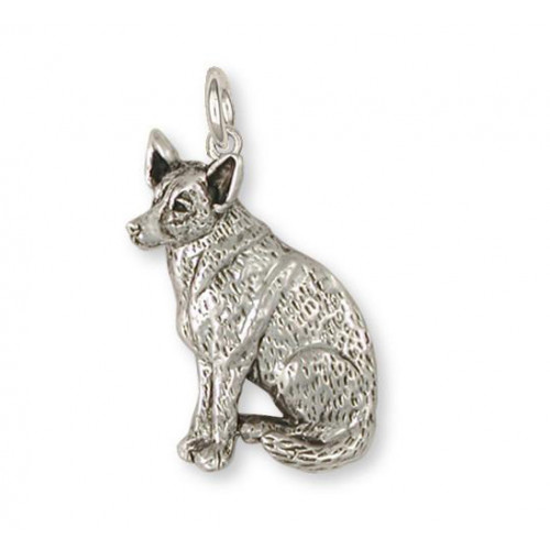 Sittande Australian Cattle Dog nr ACD01 som hänge med vanlig ringögla kan du beställa tillverkad i sterling silver. Hunden är ca 41 mm hög, den är delvis tredimensionell med något ihålig baksida och mycket detaljrik.