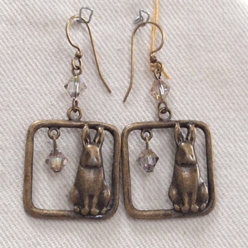 Örhängen i antikguldpläterat tenn med en söt kanin i en fyrkantig ram med mjukt rundade kanter.  Bredvid kaninen hänger en vacker kristallpärla från Swarovski i färgen Vitrail Medium.