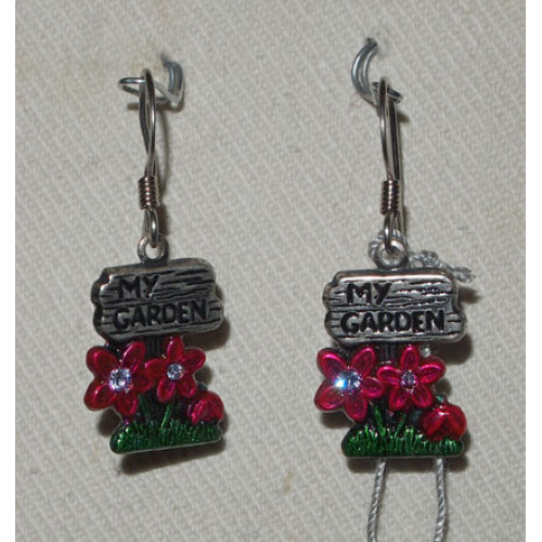 Handmålade örhängen med berlocker skylt med texten "My Garden". Under skylten finns vackert röda blommor och en liten grön gräsplätt. Blommorna är dekorerade med stenar i färgen Light Sapphire från Swarovski. Berlocken är gjord i silveroxiderad mässing.