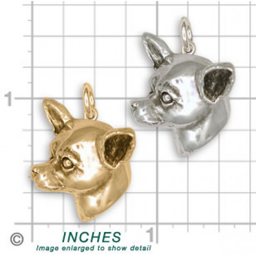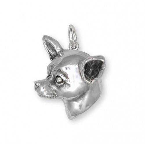 Korthårig Chihuahua Huvud nr CH53 som hänge med enkel rund ögla kan du beställa tillverkad i sterling silver. Hundhuvudet är ca 21 mm brett och 25 mm högt, det är nästan tredimensionellt med något ihålig baksida och mycket detaljrikt.