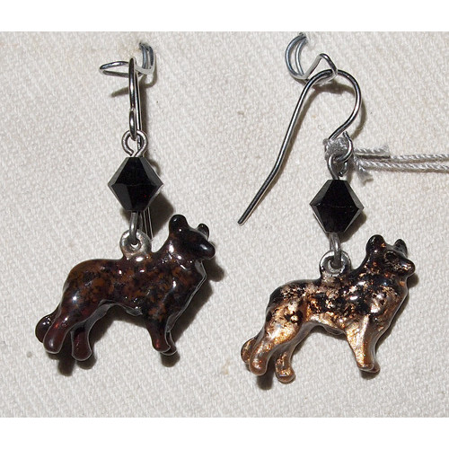 Örhängen med handmålade berlocker i tenn i form av Hollandse Herdershond, Långhårig. En hund är målad mörkbrun med svart skuggning och den andra guld med svart skuggning.