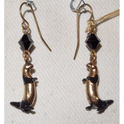 Örhängen med handmålade berlocker i guldoxiderad tenn föreställande uttrar målad med svarta detaljer.