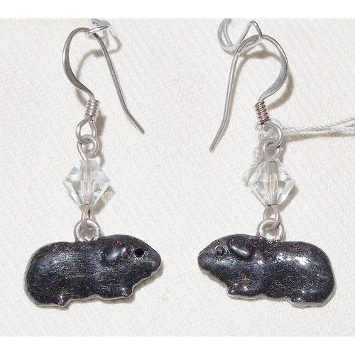 Örhängen med handmålade berlocker av tenn i form av marsvin avbildade i profil. Marsvinen är målade svarta.