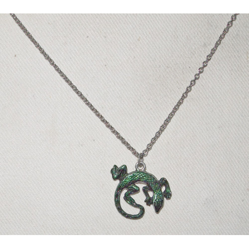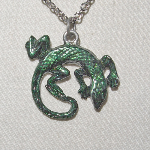 Hänge i tenn i form av en ödla, handmålad i grönt. Ödlan är ca 25 mm bred, 20 mm hög och den väger ca 7 gram.