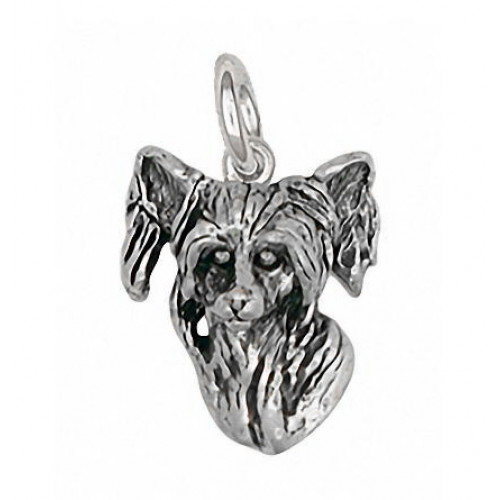 Chinese Crested Dog huvud nr CC01 gjort som hänge med enkel ringögla ögla är ca 15 mm brett , 18 mm högt och 8 mm tjockt med en vikt på ca 4 gram. Hundhuvudet är delvis tredimensionellt med något ihålig baksida och mycket detaljrikt. Det här smycket är i solitt sterling silver utan ögon av kristall.