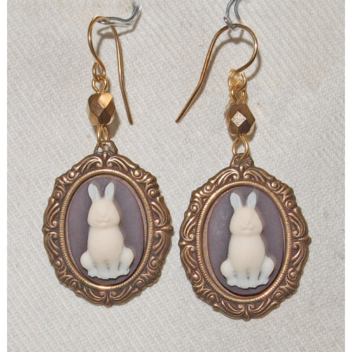 Örhängen med ovala kaméer föreställande en sittande kanin. Kaméerna är 18 x 13 mm, de är gjorda av resin med elfenbensvitt mönster på brun botten och de är monterade i infattningar av antiksilveroxiderad mässing.