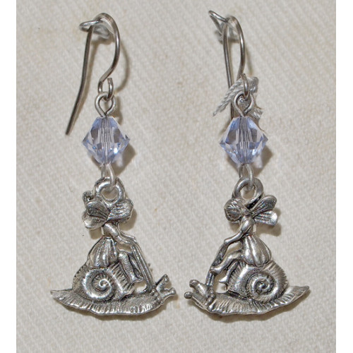 Örhängen med berlocker i tenn med motiv från sagans fantastiska värld; en älva som rider på en snigel.
