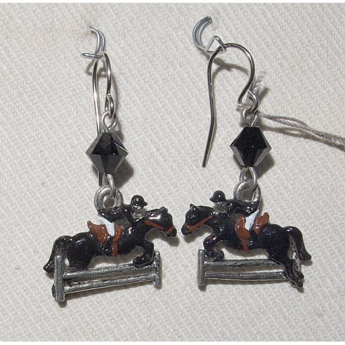 Handmålade örhängen med berlocker av tenn silveroxid med häst och ryttare som tar ett hinder. Ryttarens kläder, hjälm, sadel samt hästen är målade. Det här smycket är dekorerat med kristallpärlor från Swarovski i färgen Jet.