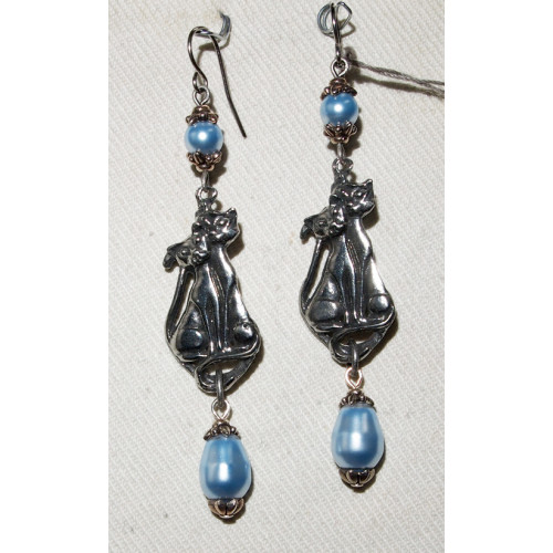 Örhängen med berlocker i silveroxiderat tenn i form av två katter som sitter tätt intill varandra med ihopslingrade svansar. Örhängena är dekorerade med Swarovski Crystal Pearls i färgen Light Blue, omslutna av vackra pärlkorgar i tenn. Örhänget i sin helhet är ca 6,5 cm långt och 2 cm brett varav kattberlocken är ca 3 cm hög.