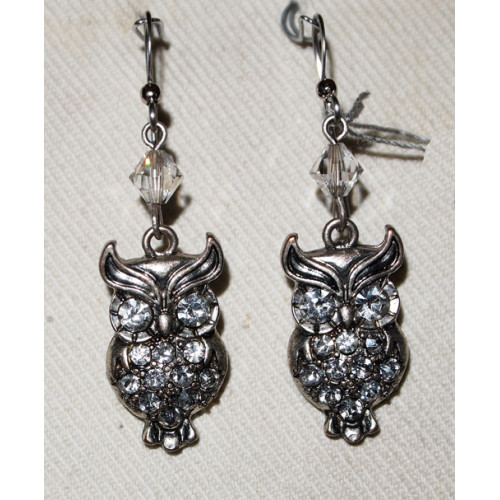 Glittrande örhängen i tenn från Unicorn Design med ett imponerande hänge som föreställer en uggla. Ovanför hänget sitter en kristallpärla från Swarovski i färgen Crystal Silver Night. Som ögon har ugglan två 4 mm kristaller och kroppen är i övrigt smyckad med tio stycken 3 mm strasskristaller från Swarovski i färgen Crystal.