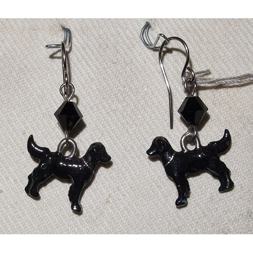 Örhängen med handmålade berlocker i silveroxiderad tenn i form av Flatcoated Retriever hundar, som är målade svarta med ursparat halsband.