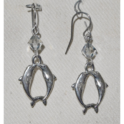 Örhängen i silveroxiderad tenn från Unicorn Design med ett hänge med två delfiner som hoppar i luften.