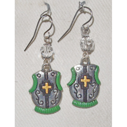 Örhängen med handmålade berlocker i silveroxiderad tenn i form av en riddares harnesk, målat i svart och grönt med guldkors.