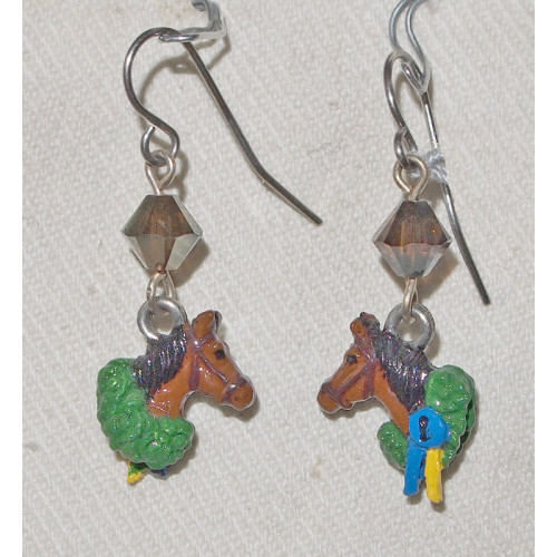 Handmålade örhängen med berlocker i tenn i form av ett hästhuvud med segerkrans.