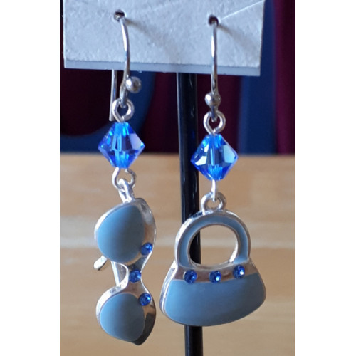 Örhängen med två berlocker i silverpläterat, emaljerat tenn föreställande ett par ljusblå solglasögon och en ljusblå handväska. Båda berlockerna är dekorerade med strasskristaller i färgen Sapphire och ovanför varje berlock sitter en kristallpärla från Swarovski, också i färgen Sapphire.
