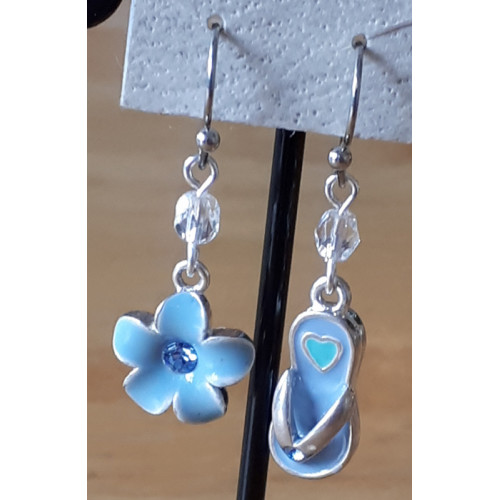 Örhängen med två berlocker i silverpläterat, emaljerat tenn föreställande en ljusblå sandal och en ljusblå blomma. Båda berlockerna är dekorerade med en strasskristall i färgen Light Sapphire, och ovanför varje berlock sitter en glasklar kristallpärla.