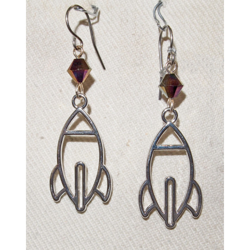 Örhängen i silverpläterat tenn som föreställer konturen av en rymdraket.