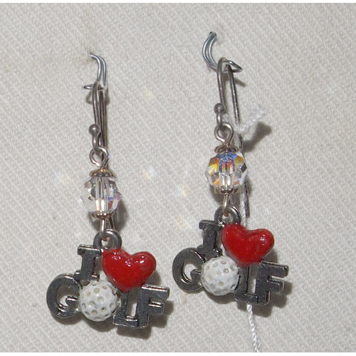 Örhängen med handmålade tennberlocker föreställande en golfboll, ett hjärta och texten "I Love Golf". Örhängena är dekorerade med kristallpärlor från Swarovski i den skimrande färgen Crystal AB.