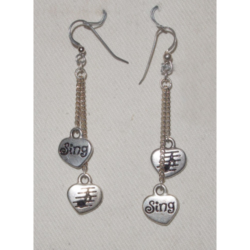 Örhängen med två tennhjärtan som på ena sidan har texten "Sing" och på andra sidan ett nottecken.