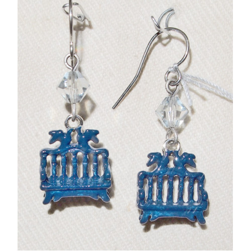 Handmålade örhängen med berlocker i tenn i form av en trädgårdsbänk målad i blått. På bänkens ryggstöd sitter ett par duvor.