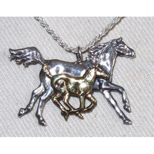 Ljuvligt hänge med sto och föl som galopperar sida vid sida, båda i sterling silver. Själva hänget är ca 40 mm brett och 28 mm hög. Hänget har en stel ögla för enkel montering på en halskedja.