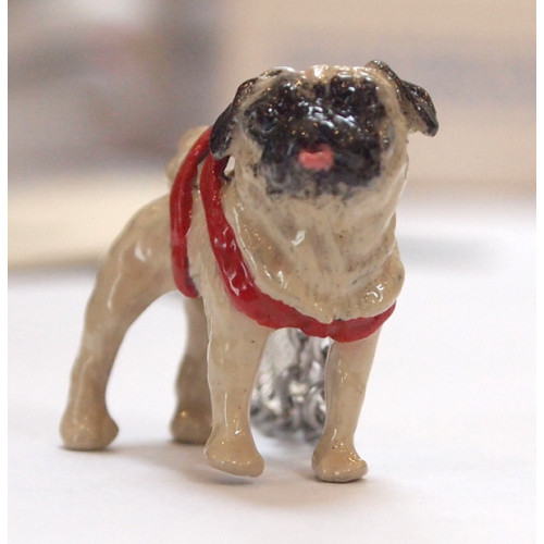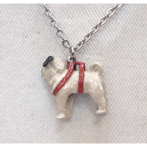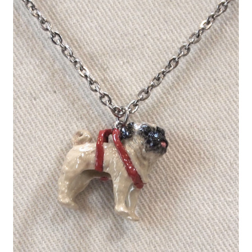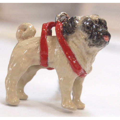 Handmålat hänge med en stående Mops tillverkad i tenn. Hänget är ganska stort, men delvis ihåligt så att det inte blir för tungt att bära.