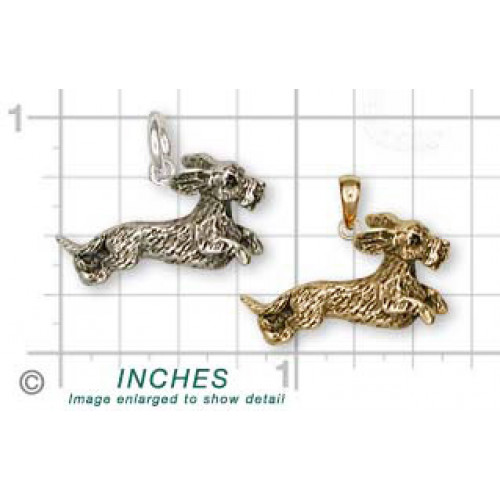 Sött smycke föreställande en glatt springande Strävhårig Tax (nr WD05) som hänge med enkel, rund ögla kan du beställa tillverkat i sterling silver. Hunden är ca 22 mm bred och 13 mm hög, den är delvis tredimensionell med något ihålig baksida och mycket detaljrik. (Det här smycket är hunden till vänster på bilden.)