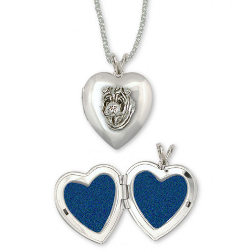 Shar Pei Huvud nr SHP02 som dekor på en hjärtformad medaljong i sterling silver, i vilken du kan sätta in två av dina favoritbilder. Medaljongen är ca 25 hög och levereras inklusive en 45 cm lång matchande halskedja i sterling silver.