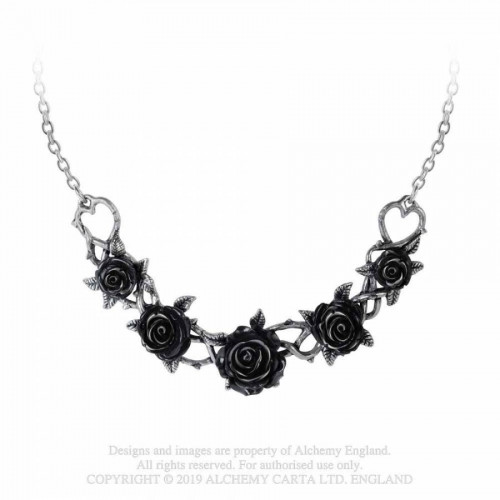 Ett halsband med dekor i tenn gjuten i ett stycke föreställande törnrosens stjälkar och blad, och dekorerad med fem stycken svarta rosor i resin. (Nickel-, bly- och kadmiumfritt enligt gällande bestämmelser.)