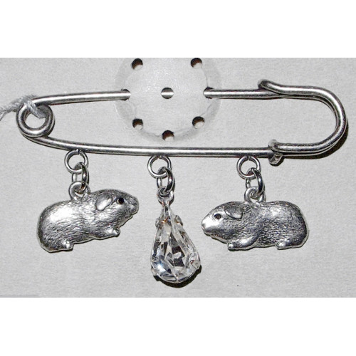 Brosch med två marsvin och en kristalldroppe monterad på en säkerhetsnål.