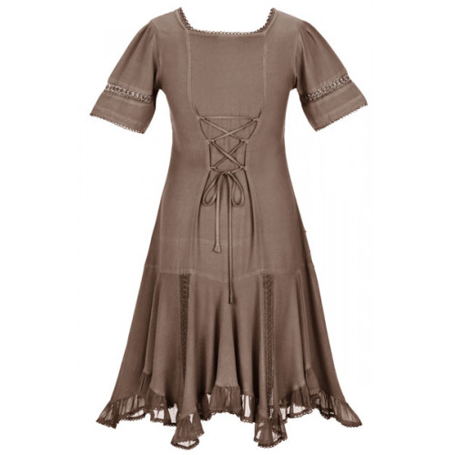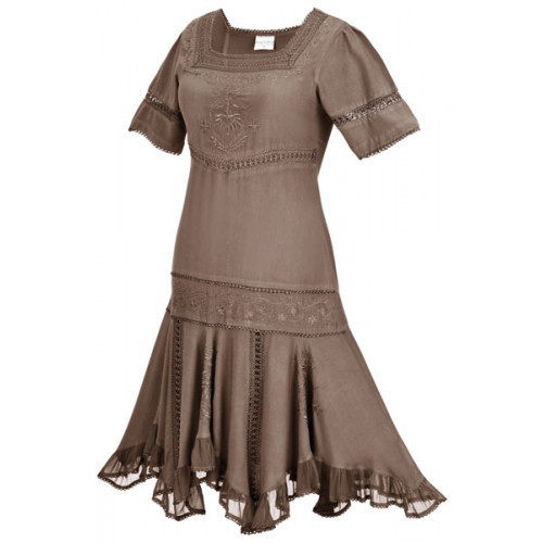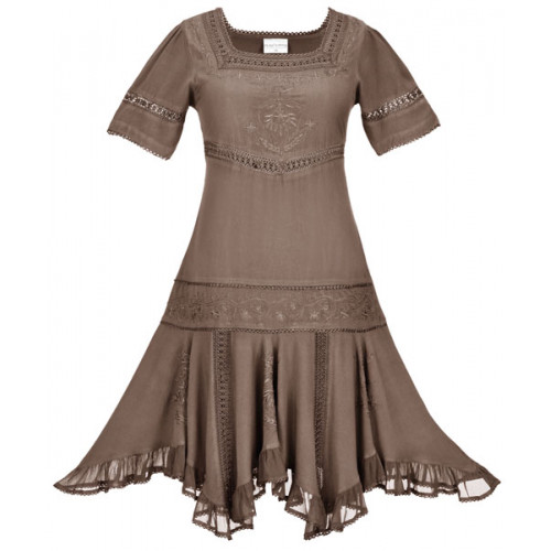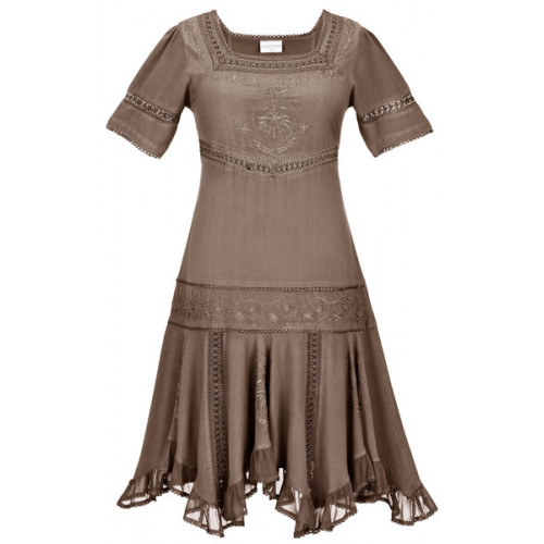 Klänningen Callie Midi är en vadlång modell som hämtat inspiration från 20-talets mode med nedhasad midja. Klänningen har en vacker spetskantad ringning och ett broderi mitt fram. Nedanför det har Callie Midi en V-formad spetsisättning, sedan ett slätt parti som avslutas med band och brodereier. Den vida kjolen är flikig, och är också den dekorerad med band och broderier för att till sist avslutas med en bred kant i chiffong. Bak har Callie Midi en snörning som både är en klädsam detalj och som ger dig möjlighet att reglera passformen. Ärmarna är korta och dekorerade med spets. Callie Midi är gjord av viscos, ett naturmaterial som tillverkas av träfibrer.