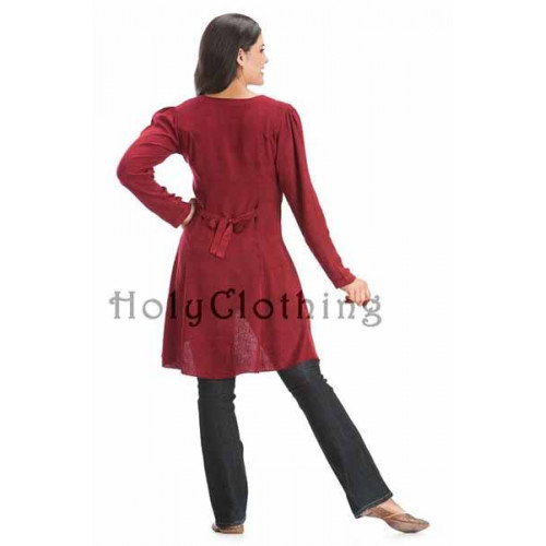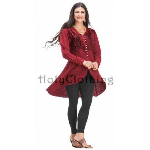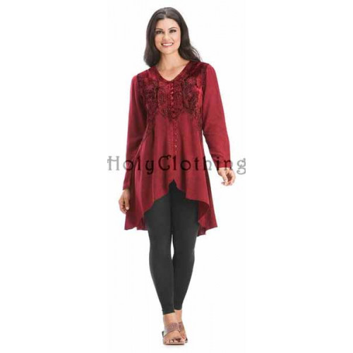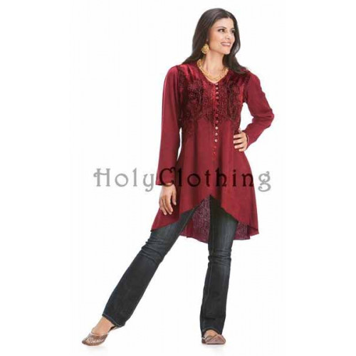 Den vackra och arbetade toppen Loralee väcker beundran hur du än bär den. Loralee har isättningar av broderad sammet på framstycket och är knäppt hela vägen fram med knappar i matchande färg. Toppen är längre bak än fram och från knäppningens nederkant är plagget mjukt sluttande. Loralee har långa ärmar och knytband bak för bästa passform.