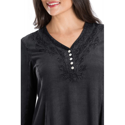 Piper är broderad runt halsringningen och knappslån, runt den flikiga fållen samt runt ärmsluten.
