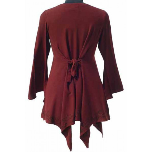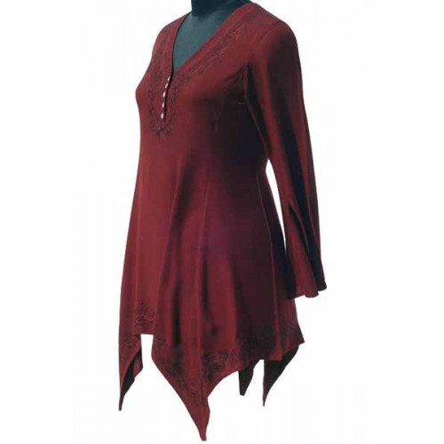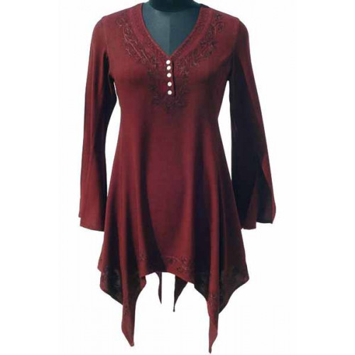 Piper är broderad runt halsringningen och knappslån, runt den flikiga fållen samt runt ärmsluten.