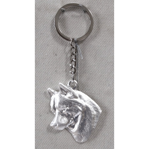 Kraftig nyckelring i stål med ett huvud av Siberian Husky i tenn. Hundhuvudet är länkat till nyckelringen med en kort kedja av stål.