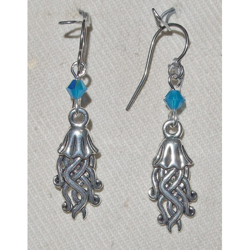 Örhängen i silveroxiderat tenn föreställande en manet.