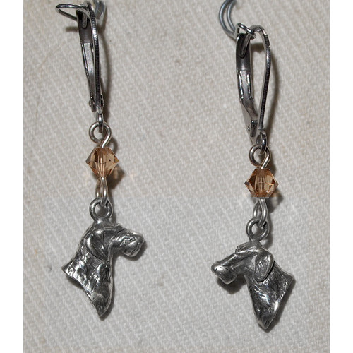 Örhängen med Tax Strävhårig Litet Huvud, gjorda som ett par där hundarna tittar åt var sitt håll. Det här hundhuvudet är skulpterat, ca 11 mm brett x 12 mm högt och tillverkat i sterling silver. Örhängena har låsbara krokar i kirurgstål. De här örhängena är dekorerade med kristallpärlor från Swarovski i färgen Light Colorado Topaz.