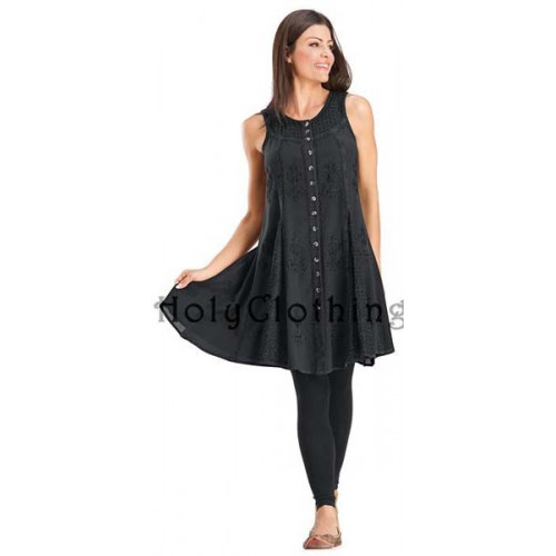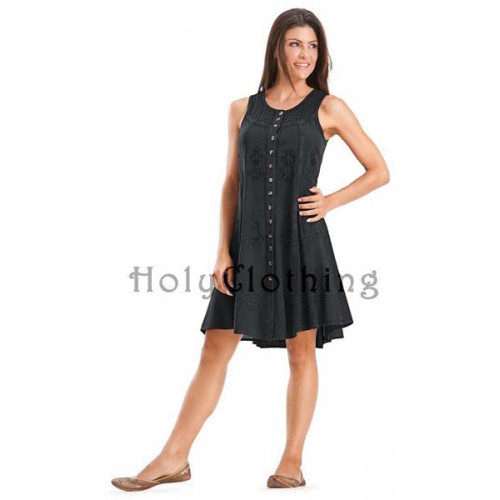 Klänningen Fiona har rund urringning och är knäppt hela vägen fram. Fiona har breda axelband, den är ärmlös och midjan markeras med ett knytband bak i ryggen. Klänningens kjol har isättningar av crepe och hela framsidan av klänningen är dekorerad och broderad. Fionas axelparti fram består också av broderad crepe. Klänningen Fiona är sydd i underbart skön viscos, ett naturmaterial som tillverkas av träfibrer.