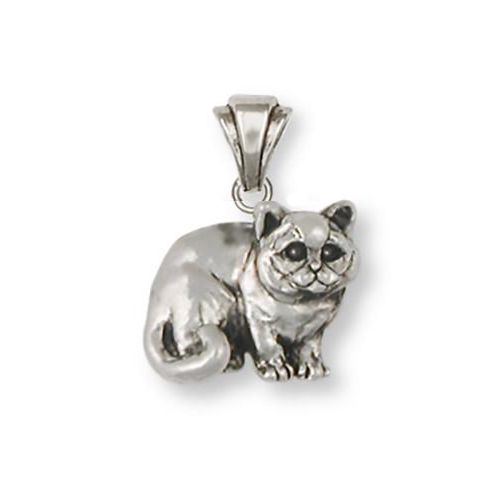 Sittande katt av rasen Brittiskt Korthår nr BRS05 som hänge med vackert skulpterad ögla. Katten är ca 14 mm bred och 13 mm hög, den är delvis tredimensionell med platt baksida och mycket detaljrik. Den här katten har fått ögon av svart Swarovski-kristall vid tillverkningen och de kostar inte extra.