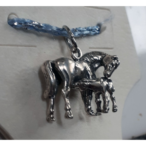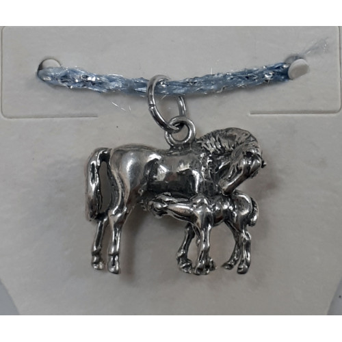 Otroligt sött, helt tredimensionellt, berlockhänge i sterling silver föreställande ett sto med sitt diande föl. Berlocken är ca 18 mm bred och 15 mm hög med en tjocklek om ca 8 mm. Smycket är ett berlockhänge med ringögla för enkel användning på en halskedja.