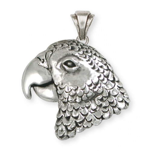 Huvudet av en papegoja av arten Grå Jako, som hängsmycke med en vackert skulpterad ögla kan du beställa tillverkat i sterling silver. Huvudet är ca 25 mm högt och väger ca 15,4 gram, det är mycket detaljrikt skulpterat med något ihålig baksida. Det här är det största papegojhuvudet av tre i samma smyckeserie.