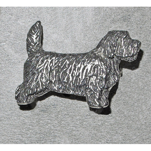 Brosch i form av ett stående Petit Basset Griffon Vendéen, tillverkad i tenn. Broschen är i omålat skick, och vi handmålar den gärna efter foto på din egen hund.