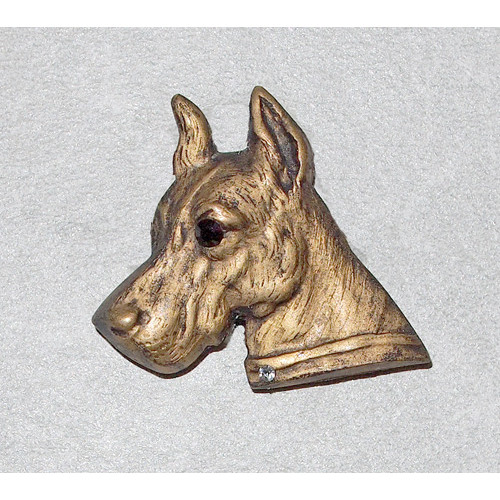 Brosch i form ett Grand Danois huvud, tillverkat i antikbehandlad mässing. Hunden har ett öga i svart kristall och små klara kristaller i halsbandet.