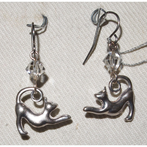 Örhängen med berlocker i silverpläterat tenn med en smidig katt som sträcker på sig. Ovanför varje berlock hänger en kristallpärla från den kände tillverkaren Swarovski i den glasklara färgen Crystal. Hela örhänget är ca 2,5 cm långt, och själva katten är ca 1,5 cm hög.