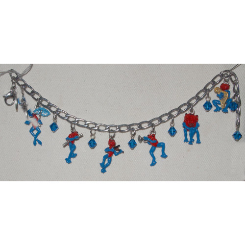 Armband med handmålade berlocker i tenn i form av sex olika grodor som sjunger eller spelar olika musikinstrument. Armbandets kedja är av rostfritt kirurgstål. Grodorna är målade som pilgiftsgrodor i rött med blåa ben och de är ca 15 - 20 mm i storlek. På armbandet sitter också sju stycken kristallpärlor från Swarovski i den härligt klarblå färgen Capri Blue.